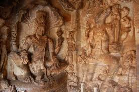 Left: Cave 3 is the largest, and dedicated to Vishnu. Right: Vishnu seated on serpent Sesha